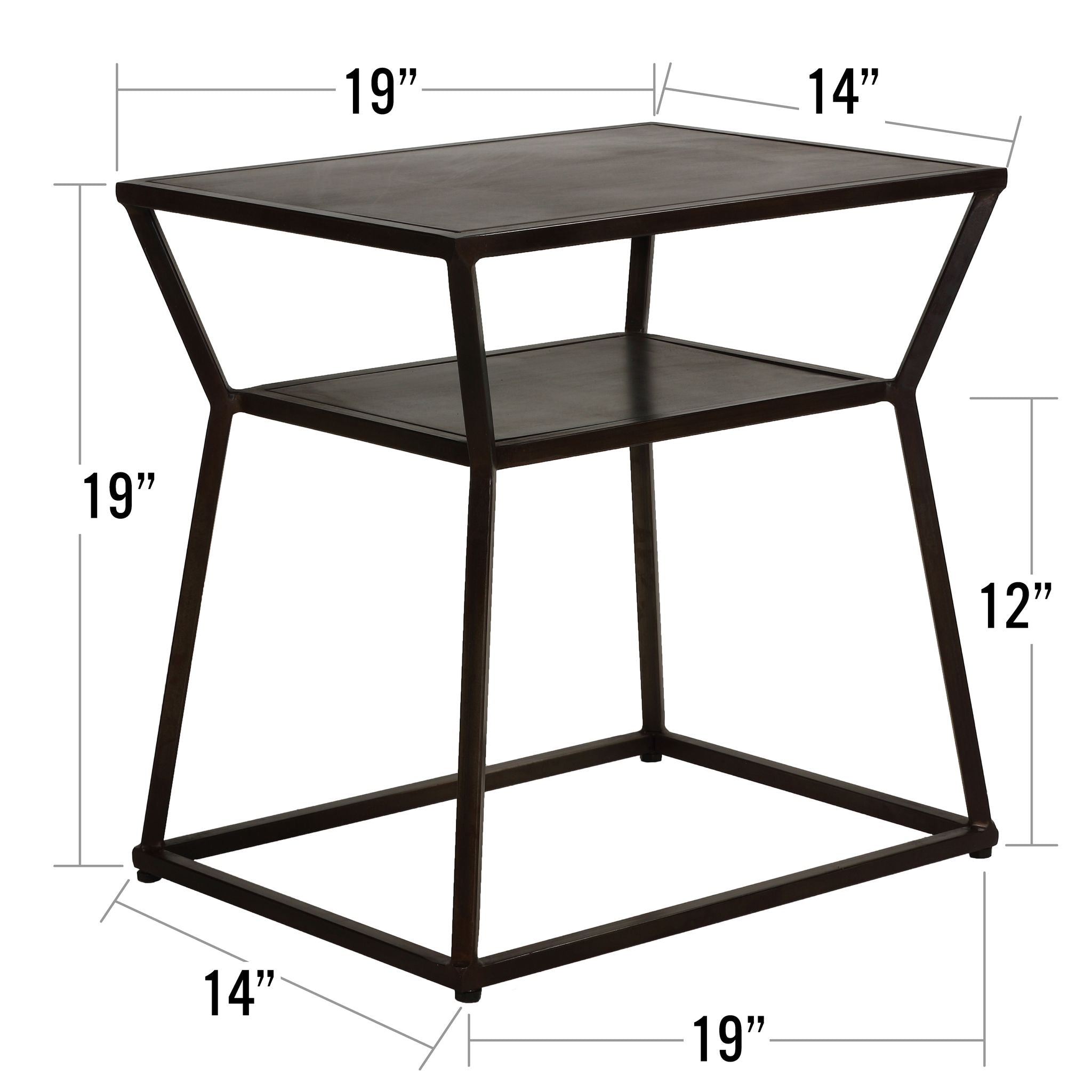 This unique table is all metal construction, and features two levels of storage. The top level is perfect for displaying your favorite items 19x14 in size, while the lower level can be used for extra storage 14x10. Floor space it takes is slightly less the the top shelf 17.75x12.75. The sleek, modern design of this table will add a touch of sophistication to any room. Its durable construction ensures that it will last for years to come. The Bare Decor Duplex Accent Table is a great addition to any home.
